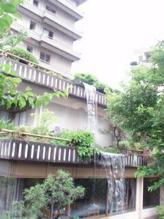 ここで有名なのは、建物の3階の庭園から流れる滝です。
