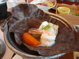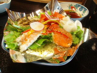 料理は、前菜いっぱいに、茶碗蒸し、海鮮サラダ、キノコと肉の炒めもの、キノコのホイル焼き、そば、カニ汁、そして船盛りです!