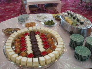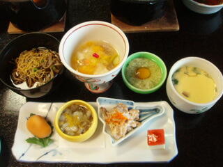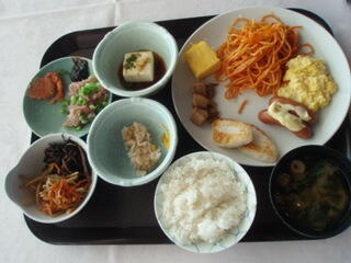 料理は、野菜、スパゲティ、スクランブルエッグ、ウィンナー、シュウマイ、冷奴、二種類のお魚、ネギトロ、おかゆ、ご飯とパン、味噌汁、笹かまぼこ、イカの塩辛、たらこ、のり、納豆、きんぴら、ひじきなどで、和食中心のラインナップです。