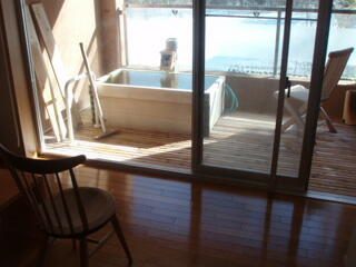 部屋は、10畳くらいで、踊り場があり、ベランダに檜の露天風呂があります。