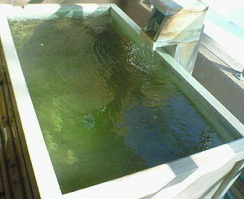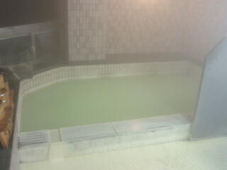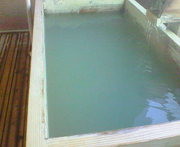 前に来たときは、乳白色だったお湯も、入れ替えたばかりなのか、バスクリンのような緑色です。中には、白い湯の華が、いっぱい舞ってます。