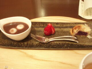 デザートは、白玉ぜんざい、とちおとめ、紫芋のパイです。これは、あったかくてうまかったですね。
