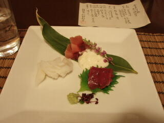 お造りは、鮪のやまかけ、イカ、鹿肉のさしみでした。